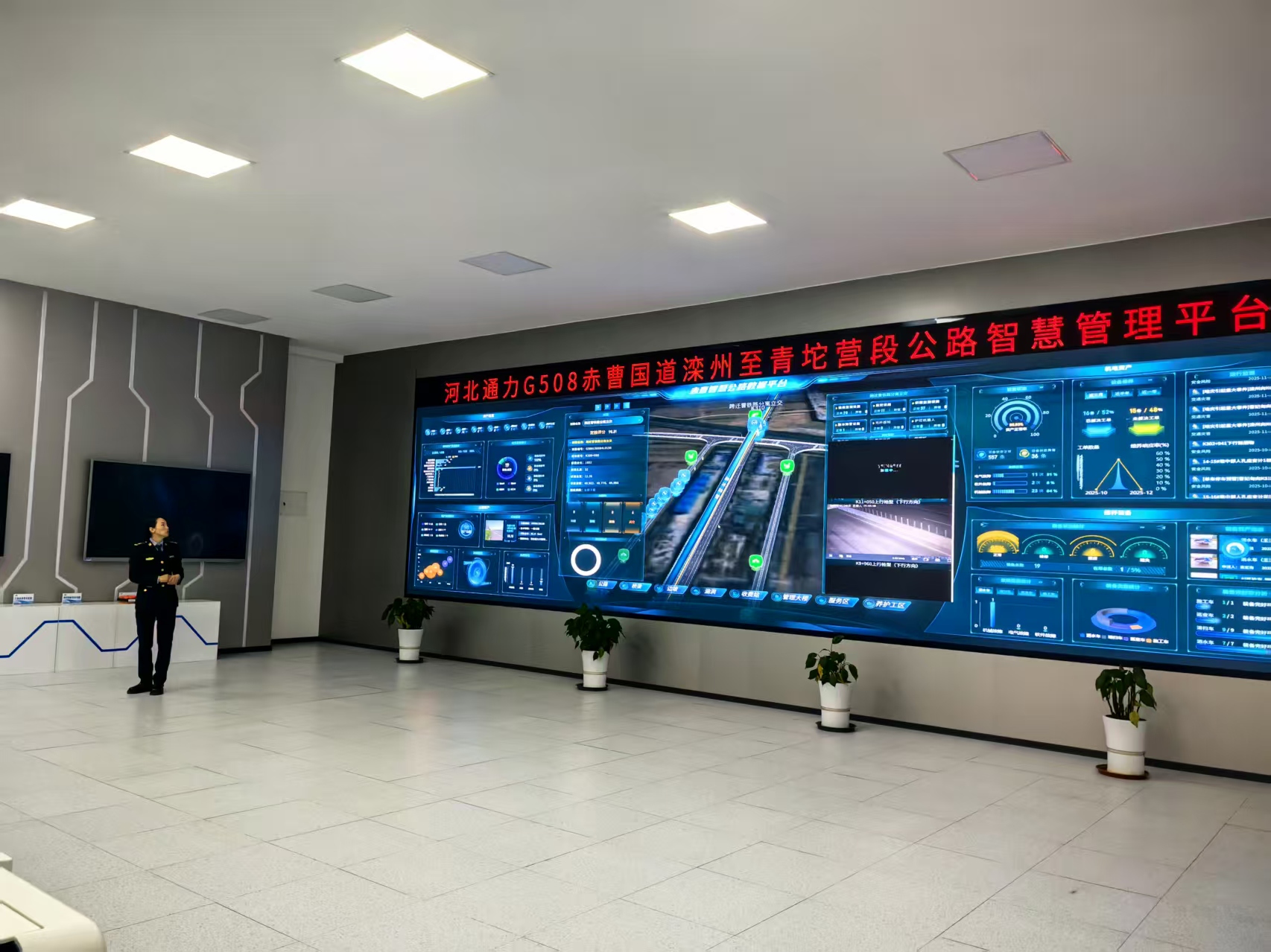调研组首先来到滦州收费站,现场观摩智能收费机器人的通行引导流程,详细询问设备信息采集精度与应急响应效率。重点了解货车通行管理、突发拥堵疏导等日常运营环节的安全管控措施,对收费站 “文明礼仪 + 应急处置” 的双优服务模式给予肯定。在监控指挥中心,调研组通过智慧调度系统查看赤曹国道全线通行状态,重点关注桥梁养护、平交口流量监测等关键点位的实时数据。并对光纤感知系统、自动化除冰融雪系统等智慧化技术的应用给予高度评价。河北通力总经理姚聪超介绍,监控中心已实现 “故障自动预警、隐患实时推送” 的智能化管理,今年 11月与交警部门完成赤曹国道沿线,交通信号设施移交后,进一步提升了协同管控能力。