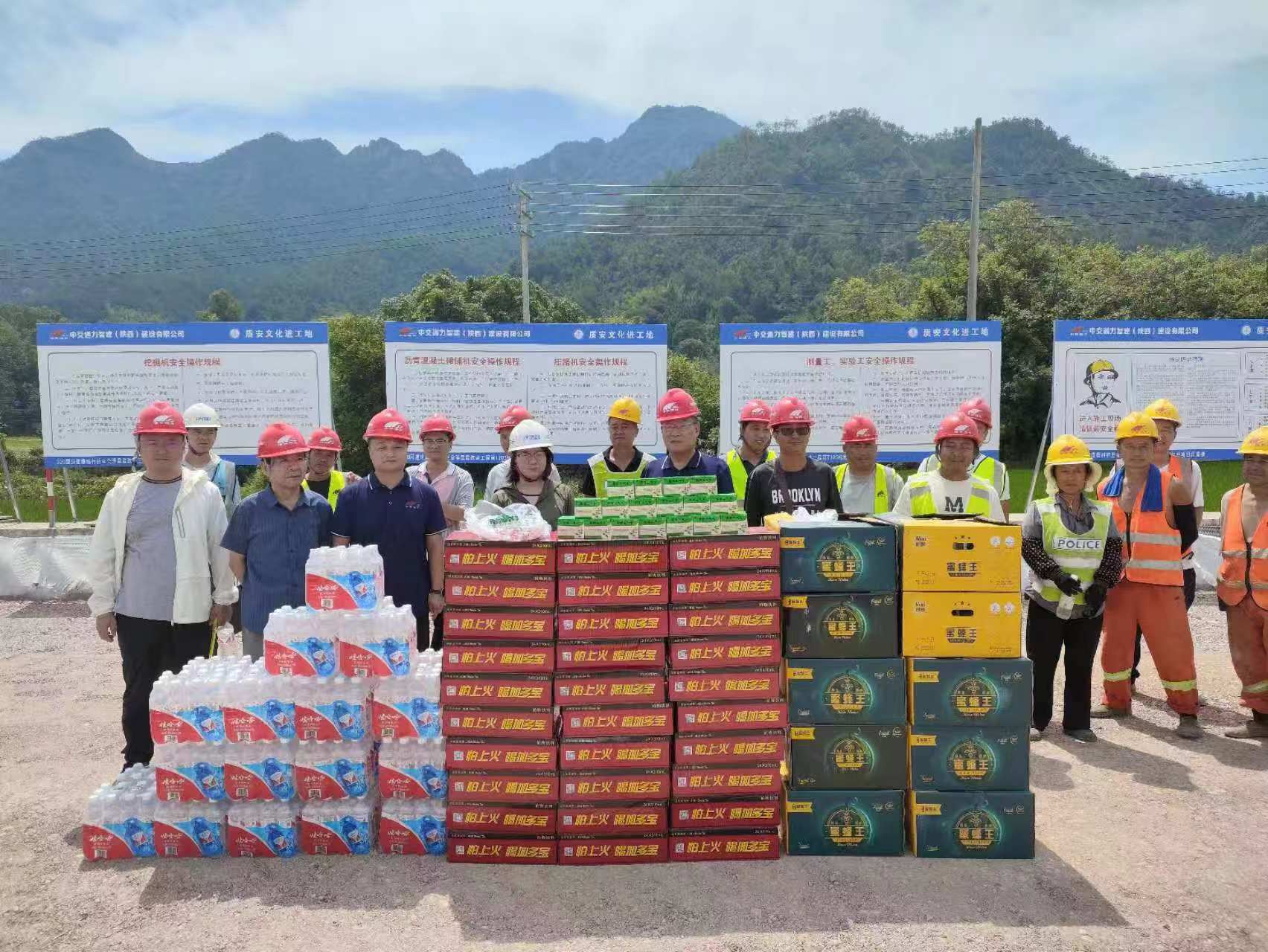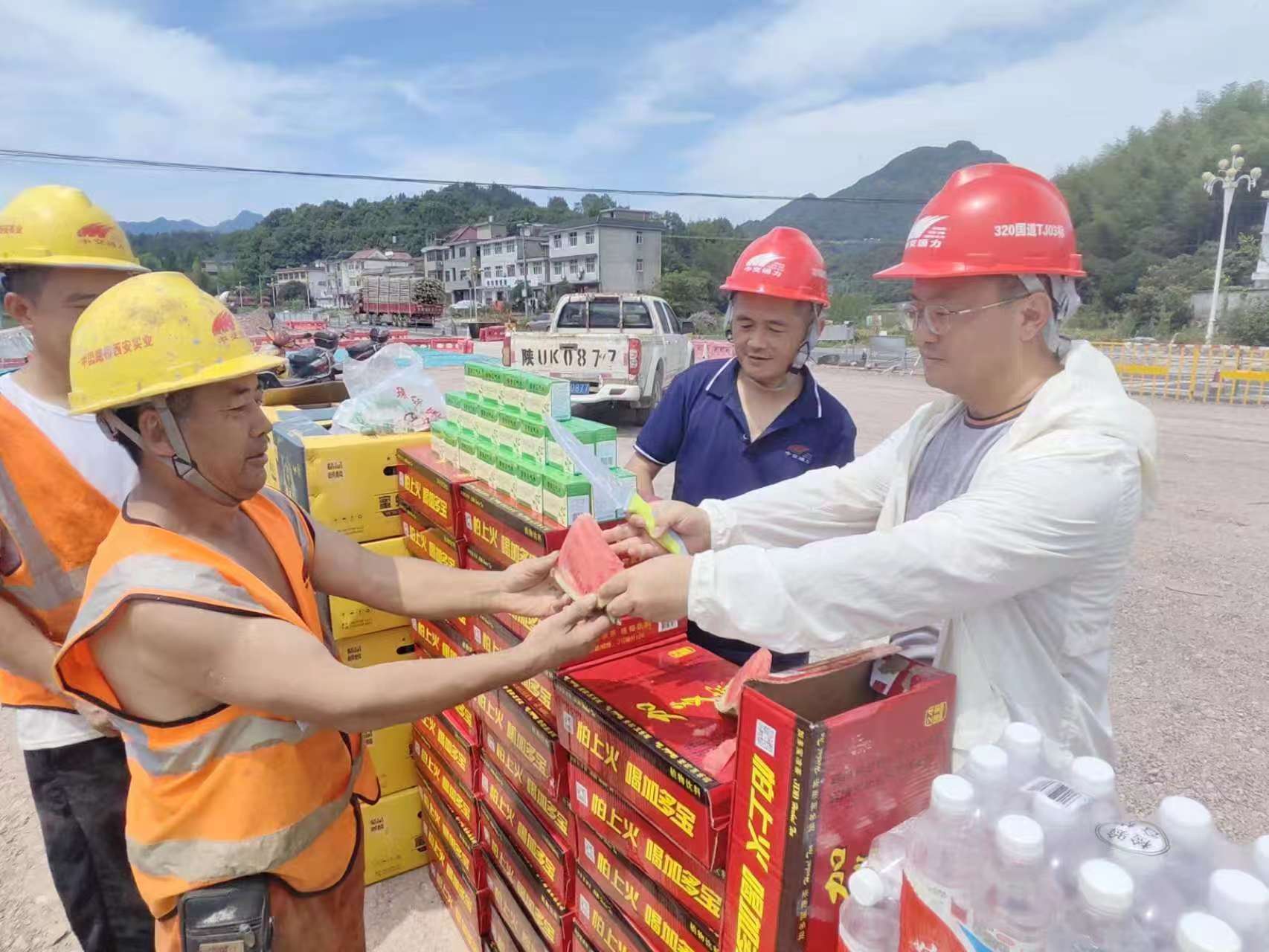 烈日当空,工地上机器轰鸣,工人们挥汗如雨,紧张有序地进行着各项施工作业。此时,由项目经理孙剑、项目总工李盼军带队,携送清凉小组一行人员来到建德320国道TJ03标项目各个施工现场,为一线施工人员送去了西瓜、凉茶、藿香正气水等防暑物品,对大家的辛勤付出表示感谢。