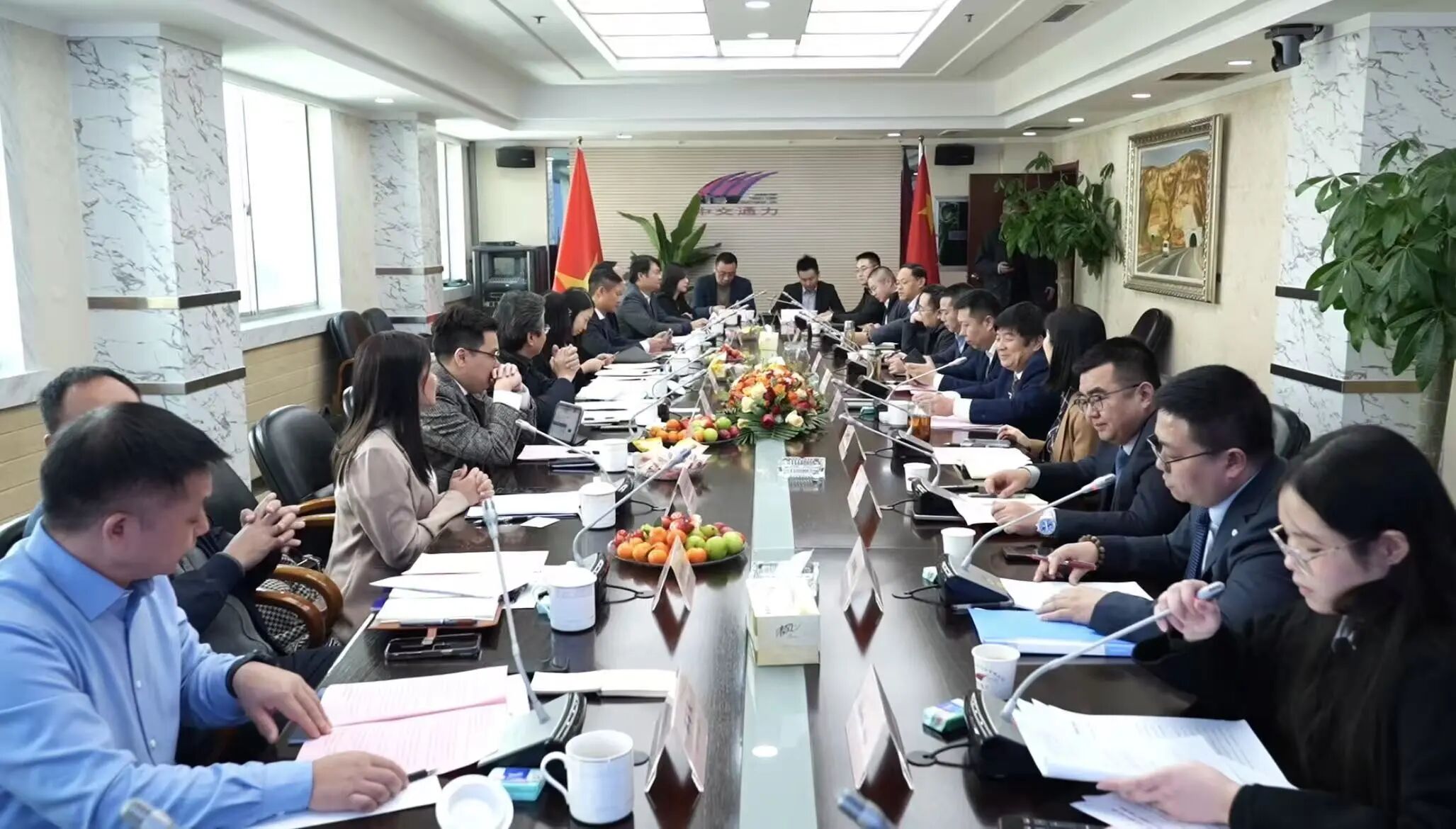 随后,越南代表团与公司高层进行了座谈交流。创始人孙忠弟首先对裴秋水副局长一行及各位企业家的远道而来表示了热烈的欢迎,并回顾了公司团队前期赴越考察的成果。他表示,中交通力始终秉持“百年企业、共同事业”的愿景,高度重视越南市场的发展潜力。孙忠弟在讲话中明确指出,公司计划于2026年第一季度完成越南本地公司注册,组建本土化项目服务团队,只为更快融入越南市场、更好地服务本地发展。他强调,中交通力愿以“资金+技术+管理”的打包模式,深度参与越南国家级高速公路、城市快速路及智慧城市项目的投资建设,并提议以河内-海防经济圈规划项目为试点,以智慧公路技术合作为突破,推动双方合作落地见效,共同书写基础设施现代化的新篇章。